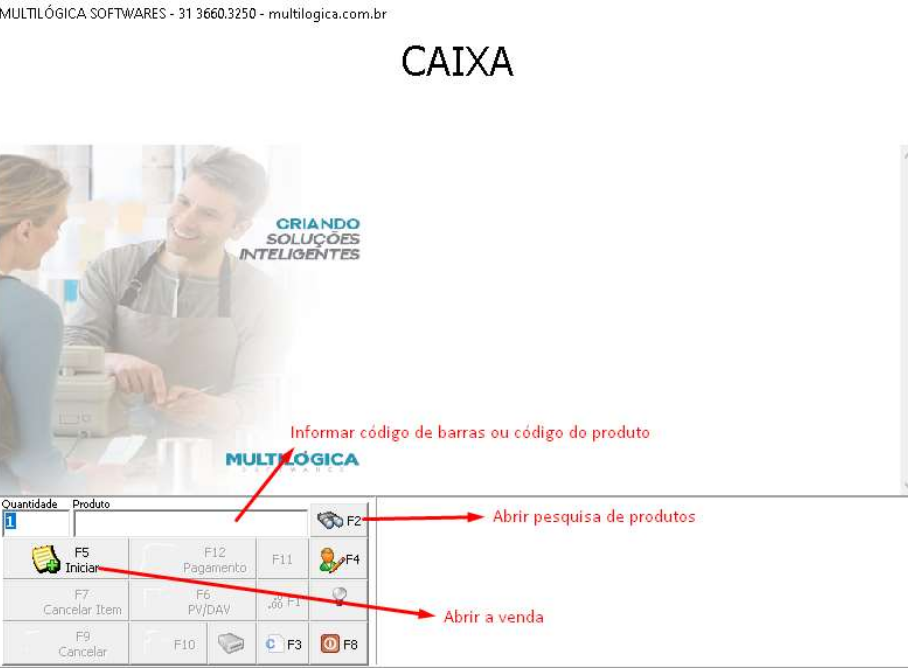 3) Na tela que será aberta, devemos digitar o código do produto ou ler o código de barras do mesmo para que a venda seja iniciada. Caso não se saiba o código do produto ou não utilize código de barras, clique no F5 para iniciar a venda e no F2 para pesquisar o produto.