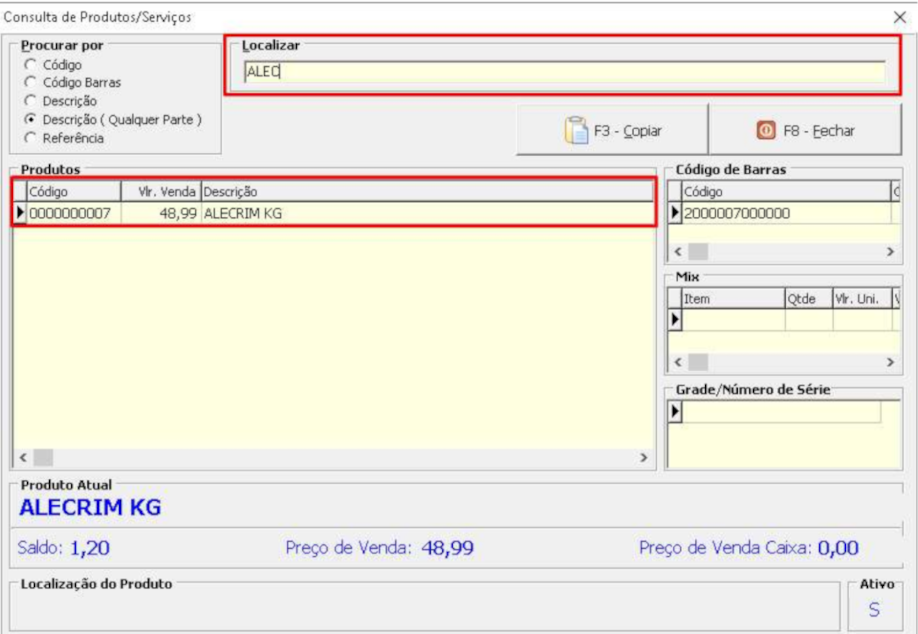4) Na tela de pesquisa de produtos, basta digitar o nome ou parte do nome desejado e dar um clique no item para carregar para a tela de venda: